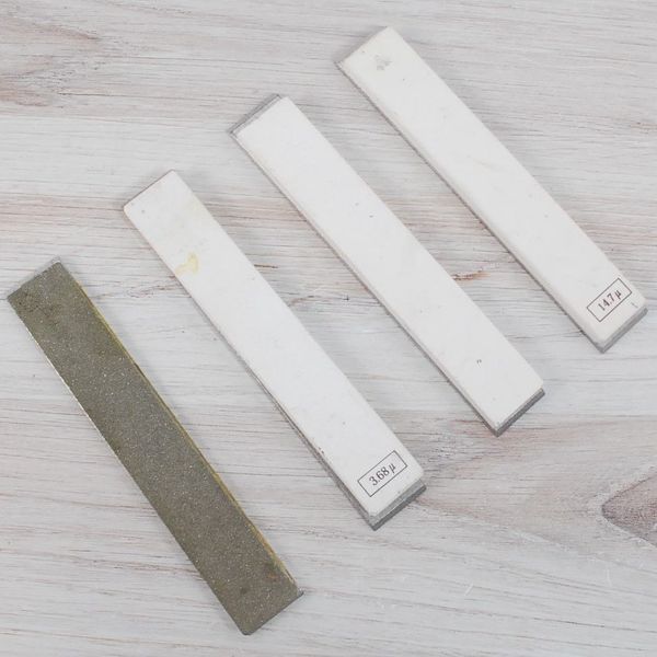 This four-piece Shapton stone set for Edge Pro contains a 140 CKTG Diamond Plate, a Shapton Glass Stone 500, a Shapton Glass Stone 1K, and a Shapton Glass Stone 4K. As you can see by the pictures, two are glued off-center, and all of them have overspray on them.