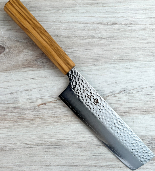 This knife features a stainless Damascus (suminagashi) cladding with a hammered (tsuchime) finish that helps reduce sticking and adds visual depth. The flat profile makes it ideal for push cutting vegetables, while the thin grind gives it a smooth, effortless feel on the board. The octagonal olivewood handle provides a comfortable, secure grip (note: older videos may show an ebony handle). This is a great choice for anyone looking for a beautiful, low-maintenance nakiri with excellent performance.