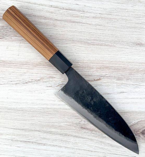 Hatsukokoro's Blue #2 line of knives features good-quality carbon steel with simple kasumi or kurouchi finishes and nice handles at good prices. This knife is unique in that it is thick like a deba but has a double bevel construction.
