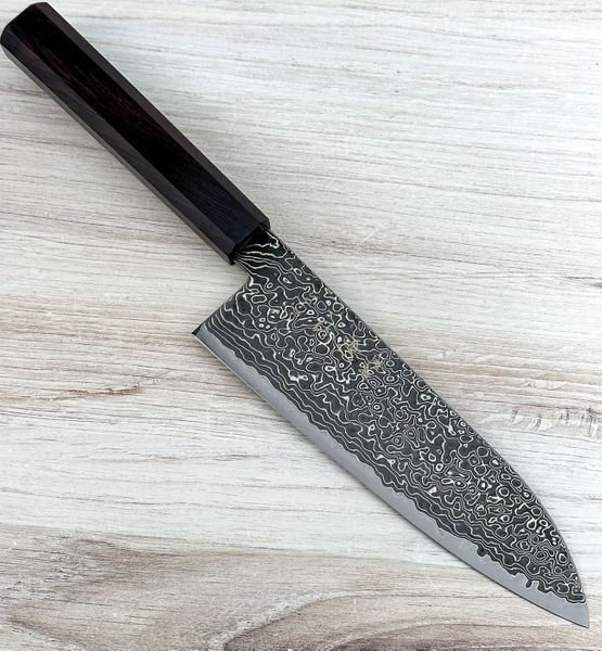 The octagonal ebony handle is crafted for comfort and control, giving the knife a refined, traditional Japanese feel that pairs beautifully with the Damascus blade.