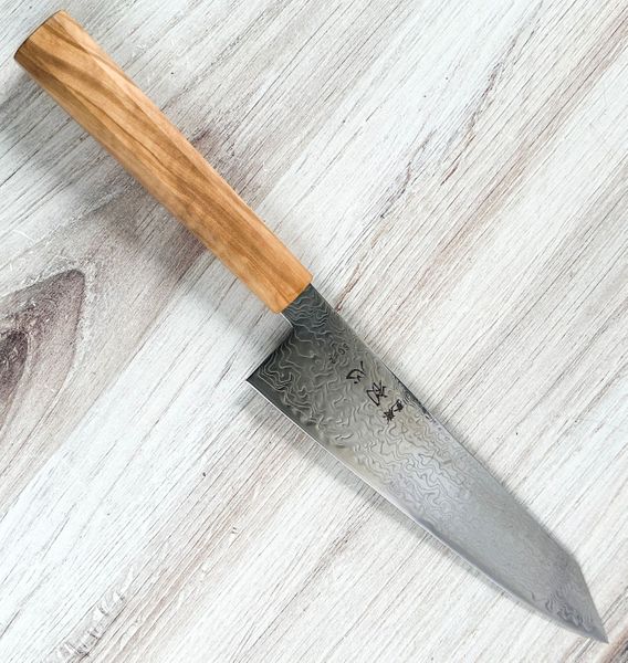 The SG2 core delivers outstanding edge retention and stainless convenience, while the polished Damascus cladding adds durability and visual appeal. At only 130 grams, the knife feels lively in hand with excellent balance and cutting feedback.