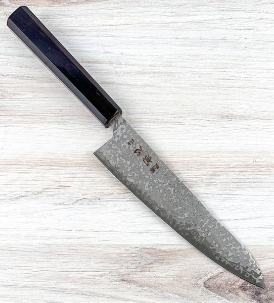 Maker: Hatsukokoro Location: Sakai, Japan Steel: SLD Edge: Double Bevel - 50/50 Handle: Octagonal Ebony Weight: 4.7 oz (134 g) Edge Length: 199 mm Total Length: 340 mm Spine Thickness at Base: 2 mm Blade Height: 43 mm