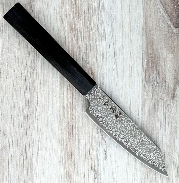 Maker: Hatsukokoro Location: Sakai, Japan Construction: San Mai Edge Steel: SLD Semi-Stainless Cladding: Stainless Damascus Edge: Double Bevel 50/50 Handle: Octagonal Ebony Weight: 2.7 oz (76 g) Edge Length: 115 mm Total Length: 243 mm Spine Thickness at Base: 1.5 mm Blade Height: 30 mm