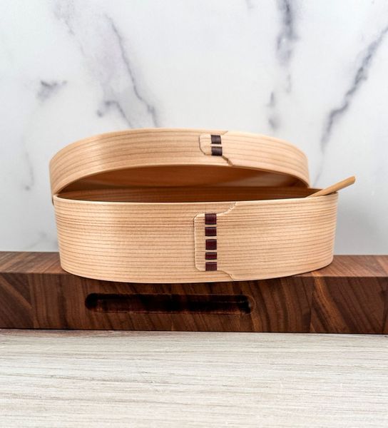 Unlike many modern bent-wood boxes produced with a protective urethane layer, this version is offered in a pure natural finish at our request. There is no coating—only the authentic look, aroma, and texture of Japanese cedar. Because natural wood can breathe and slightly shift with humidity, each piece will develop its own character over time. Production is small-batch, and availability is limited.
