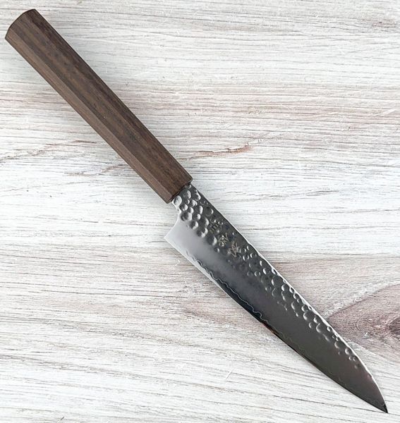 Hatsukokoro Hayabusa VG10 Tsuchime Suminagashi. It's a mouthful, so let's break it down. Hatsukokoro is the maker's name. Hayabusa, the Japanese word for falcon, means "high performance." VG10 is the stainless steel used on the edge of the knife. Tsuchime means "hammered." Suminagashi means "Damascus." Experience a great Japanese cutting tool at a great price.