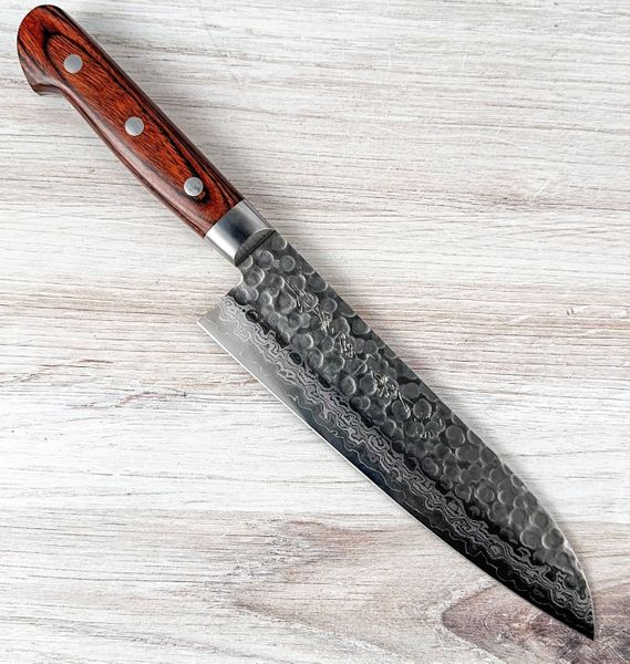 Kikuichi has a long history of making fine kitchen knives, and this Warikomi Damascus Santoku is a versatile all-purpose cutter designed for daily prep in home and professional kitchens. The blade uses a VG10 core wrapped in 17 layers of Damascus cladding. VG10 offers good edge retention, stain resistance, and toughness, making it an ideal choice for a hardworking, everyday knife. The layered Damascus pattern gives the blade a refined look, while the hammered surface encourages food release as you cut.