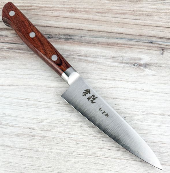 The finely ground blade of this lovely 120mm petty is welded to a stainless steel bolster, and a Western-style mahogany handle is attached with three stainless rivets.