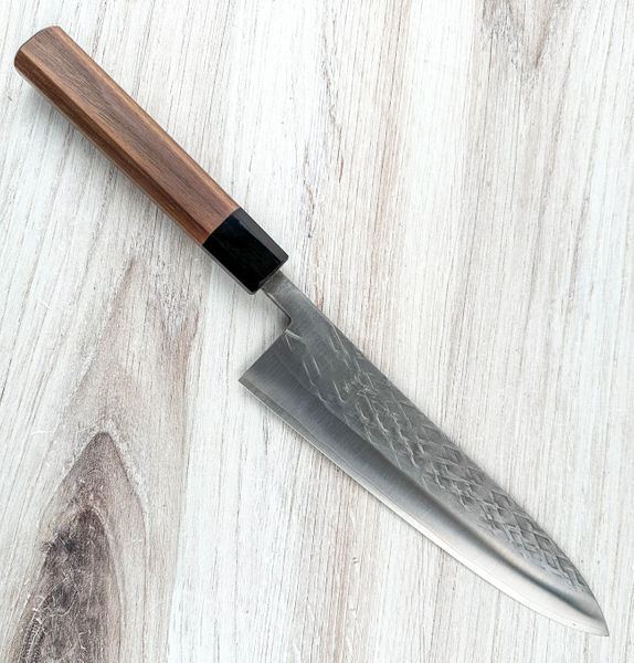 A very unique lattice work aesthetic with a polished finish adorns the knife. Please note, the handle has been upgraded from the old one on the video to the new, nicer walnut octagonal handle shown in the photo with black pakka wood ferrule. It's a big upgrade in the look and feel of the knife. These are handcrafted knives so each one is unique and some variation should be expected.Brand: Kohetsu