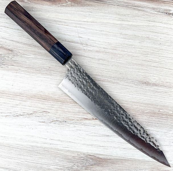 A really nice octagonal handle made of rosewood with a pakka wood ferrule echoes the fine fit and finish of the blade and completes a well made, great performing kitchen knife package.Blacksmith: Yu Kurosaki