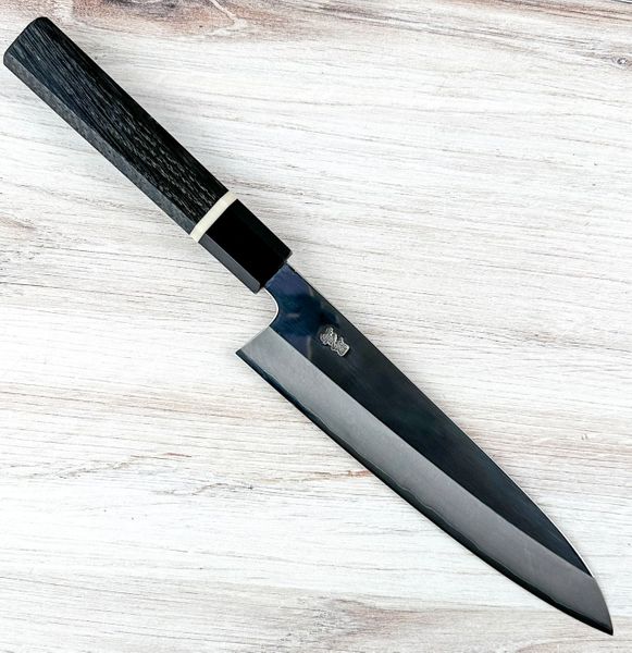 Brand: Kurotori Blacksmith: Hiroshi Kajihara Location: Shimanto, Kochi, Japan Construction: San Mai, Hammer Forged Edge Steel: Ginsan Edge Grind: 50/50 Even Cladding: Stainless Finish: Mirror Polish Hardness: HRC 61 Weight: 5.4 oz (154 g) Edge Length: 210 mm Total Length: 365 mm Spine Thickness at Heel: 3 mm Blade Height: 47 mm Handle: Octagonal Bog Oak This knife has a difficult to photgraph mirror finish. It's more like pictures 2 and 3 in person.