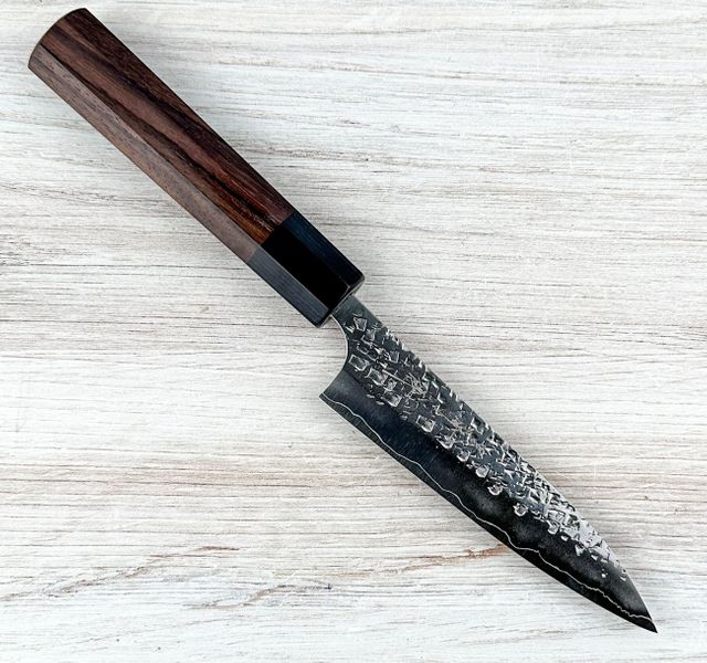The Kurosaki R2 Petty 120mm is as impressive in performance as it is in appearance. Crafted by Kurosaki-san and his brother, this knife features an R2 stainless steel core, encased san-mai style in a protective stainless steel cladding. The core steel is hardened to 62 HRC, ensuring exceptional edge retention and durability.