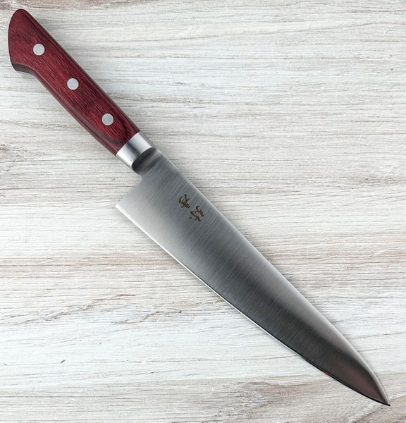 The blade uses AUS-8 stainless steel, a proven Japanese alloy known for its excellent balance of edge retention, toughness, and easy sharpening. It takes a very fine edge and is forgiving enough for everyday use, making it a great choice for both home cooks and professionals. The grind is thin behind the edge for smooth cutting performance, and the 210mm gyuto profile provides excellent versatility for slicing meats, chopping vegetables, and handling most kitchen prep tasks. Like most thin Japanese knives, avoid hard bones, frozen foods, or twisting cuts to prevent edge damage.