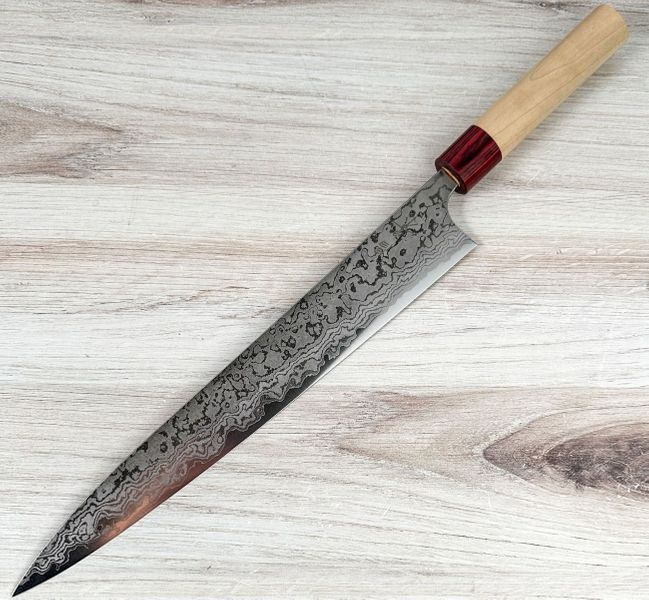 Brand: Masakage Blacksmith: Yoshimi Kato Location: Echizen, Japan Construction: San Mai, Hammer Forged Cladding: 49-Layer Stainless Damascus Core Steel: VG-10 Stainless HRC: ~61–62 Handle: Magnolia Wood (Oval) Ferrule: Red Dyed Pakka Wood Engraving: Hand Engraved Edge Grind: 50/50 Weight: 5.5 oz (158 g) Edge Length: 300 mm Total Length: 450 mm Spine Thickness at Heel: 2.7 mm Blade Height: 44 mm