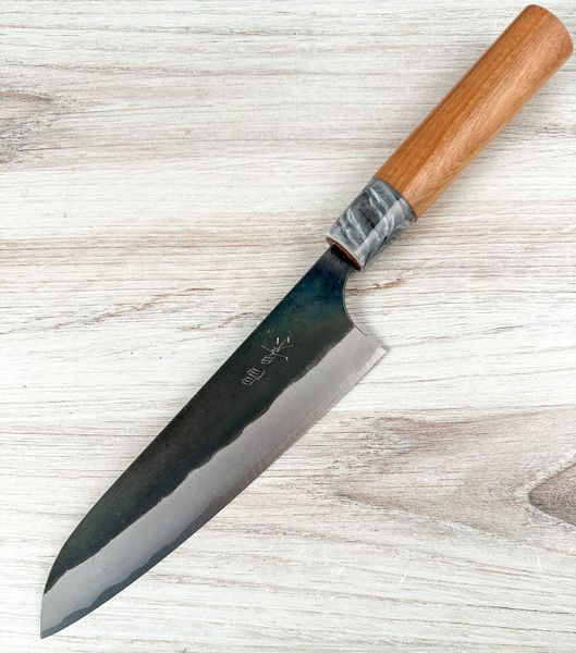 Balancing elegance and comfort, the ergonomic handle is crafted from Japanese cherry wood, shaped in a smooth oval form for a natural grip. A marbleized resin ferrule adds a touch of refinement and durability, making this knife as visually stunning as it is functional.