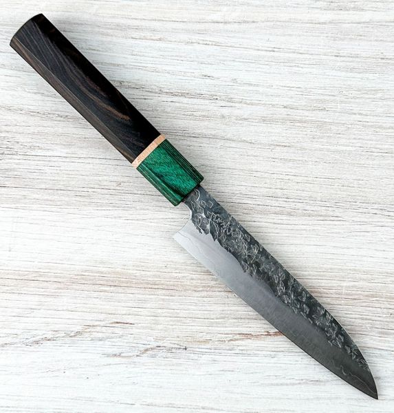At the core is SGSTRIX powdered stainless steel, known for excellent edge retention, fine grain structure, and relatively easy sharpening for a high-performance steel. The octagonal wa handle pairs dark wood with a green ferrule and light spacer, providing a balanced, comfortable grip for extended prep. Light, nimble, and beautifully finished, this petty is ideal for cooks who value craftsmanship and performance in a smaller format .
