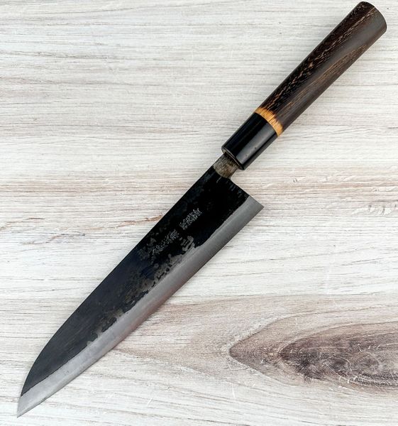 This knife has some minor finishing issues which are visible in the pictures. Our custom handle installer taped the kurouchi finish and left it on for a long period of time and when pulling it off some of the kurouchi finish came off with the tape. It's otherwise in new condition and includes a beautiful burnt chestnut D handle.