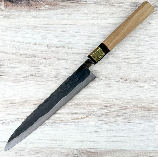 The Moritaka Supreme Sujihiki blends traditional sword-making heritage with modern kitchen performance. Although labeled by Moritaka as a yanagiba, this knife features a double-bevel grind, making it functionally a sujihiki suited for precise slicing of proteins and fish. The flatter edge profile and narrow 32 mm blade height promote clean, controlled draw cuts with minimal resistance.