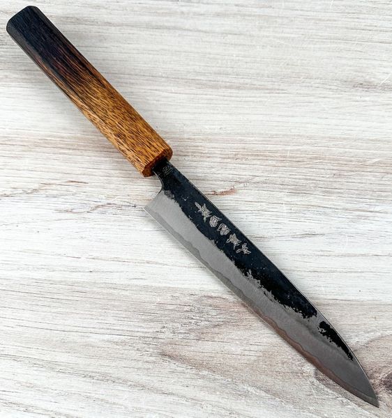 This 150 mm petty features a core of Aogami Super (Blue Super) carbon steel, hardened to around HRC 64. The core is clad in reactive soft iron with a kurouchi (black-forge scale) finish, giving the knife a rustic, traditional appearance and helping slow the development of rust or patina. Aogami Super is known for its excellent edge retention and sharpness.