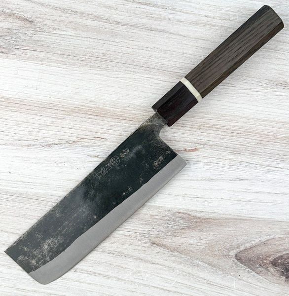 **Each knife is made by hand, so measurements may vary.**Brand: Nakamura Hamono Location: Nakatsu City, Oita Prefecture, Kyushu Construction: Hammer-Forged, San-Mai Core Steel: Blue #2 Carbon Steel Cladding: Stainless Steel Finish: Kurouchi Edge Grind: Double Bevel (Even) Handle: Carbon-Dated Bog Oak (Approx. 4,000 Years Old) Weight: 5.6 oz (158 g) Edge Length: 166 mm Total Length: 312 mm Spine Thickness at Base: 4 mm Blade Height: 53 mm