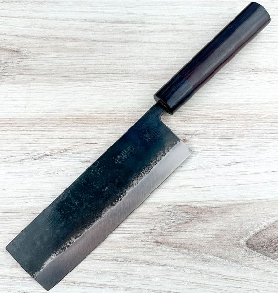 With its wide blade and flat edge profile, this nakiri excels at push cutting, chopping, and clean, controlled vegetable work. The rustic kurouchi finish helps protect the blade during forging and gives each knife a unique appearance. A comfortable oval rosewood handle with a black pakka wood ferrule completes the knife, offering a secure grip and good balance despite the knife’s substantial build.