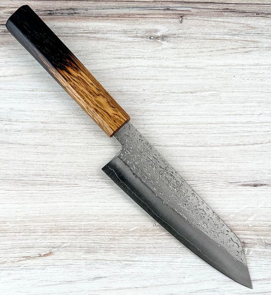 Okeya is a small father-and-son workshop located in Miki, Japan, known for producing highly functional kitchen knives at very attractive prices. This knife uses Ginsan (Silver #3) stainless steel from Hitachi, a premium Japanese stainless steel that takes a very fine edge while remaining tough, stain-resistant, and easy to sharpen. The blade is hammer forged and finished with a handsome tsuchime pattern that helps with food release and adds visual character. The knife is paired with a comfortable oak octagonal handle finished in burnt urushi lacquer, giving it a traditional Japanese look and excellent grip in both professional and home kitchens.