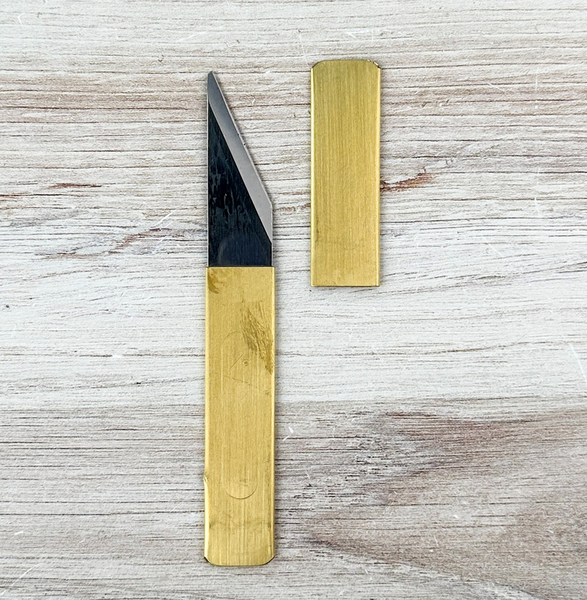 Style: Slim Kiridashi Edge Steel: SK5 Carbon Steel Handle Material: Brass Saya Material: Brass Stamp: Kanji stamp reading “Pennant Knife” Overall Length: 127mm Width: 17mm Thickness: 1.7mm Weight: 20g