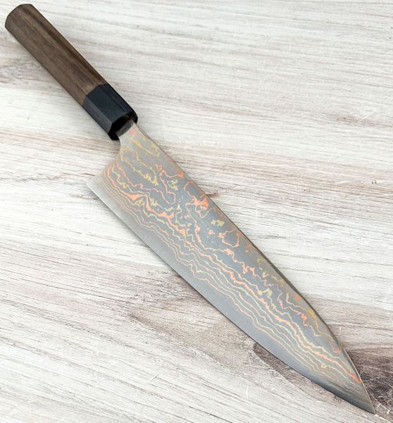 Saji Rainbow Damascus Blue #2 Wa Gyuto 210mm. There is no doubt that Takeshi Saji makes some of the best-looking kitchen knives available today. He balances the functional aspects needed in a great blade with the aesthetic appeal sought by many buyers and collectors of fine knives. They are eye-catching but in a restrained way that only adds to their great appeal.