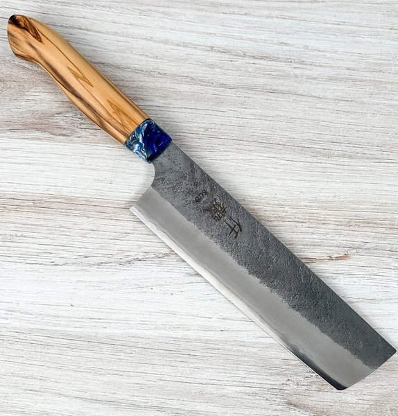 The blade features stainless steel cladding for improved corrosion resistance, finished with a lightly textured nashiji surface on the upper portion and an exposed SLD edge for a clean, functional look. The olive wood handle offers a comfortable, natural feel in hand, while the blue acrylic ferrule adds a bold visual accent and long-term durability. Well-balanced and precise, this nakiri is an excellent choice for anyone who does a lot of vegetable prep.