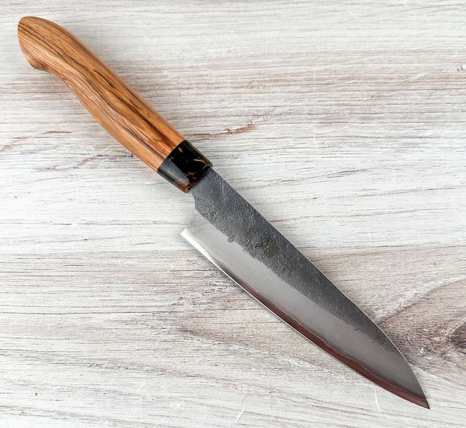Care Instructions: Hand wash only and dry immediately after use. Do not store the knife wet or leave it in a sheath or saya while damp. Avoid cutting hard or frozen foods. Use a wooden or soft synthetic cutting board. SLD steel is semi-stainless and may develop a light patina over time; this is normal and does not affect performance.