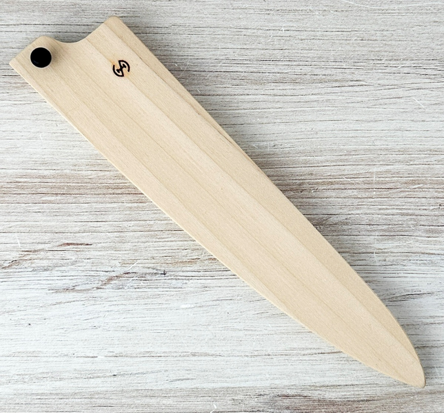 This wooden saya — the Japanese term for a knife sheath or blade scabbard — is designed to fit the 150mm petty knives we carry, providing safe, secure protection during storage or transport. The petty is a nimble, slender utility knife, and that trim profile makes precise fit especially important: even small differences in blade height, thickness, or profile can affect how a Japanese kitchen knife seats inside a wooden saya, which is why compatibility is tightly controlled.