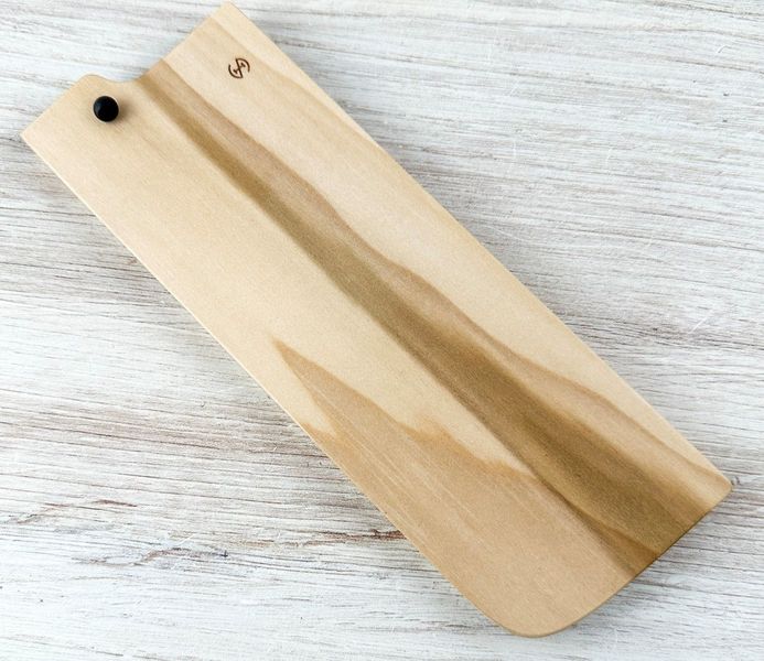 This wooden saya (鞘), the Japanese term for a blade scabbard, is designed to fit nakiri knives we carry and provide safe, secure protection for the blade during storage or transport. This B version is intended for larger nakiri profiles where the slimmer A saya is too narrow. All B sayas are made slightly larger than their A counterparts to accommodate taller blades and thicker spines. Fit is critical with wooden sayas, and even small differences in blade height, thickness, or profile can affect how the knife seats inside the scabbard, which is why compatibility is tightly controlled.