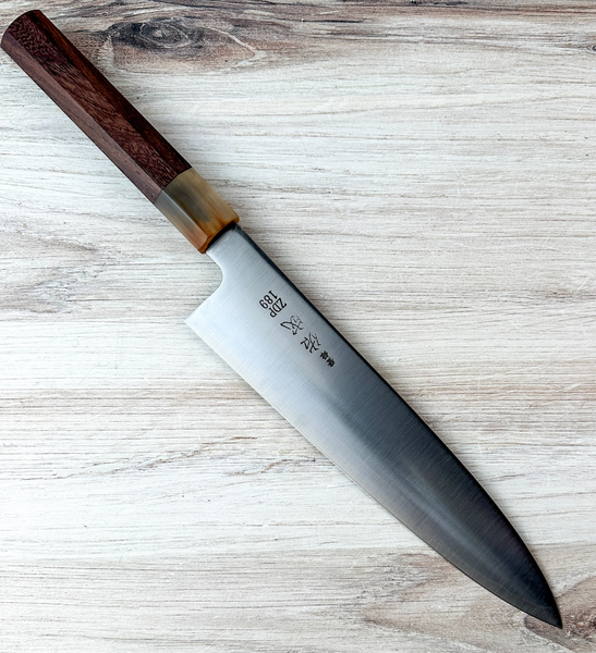 Designed for balance and precision, the blade measures 231mm long with a 51mm height, a spine thickness of just 3mm, and a well-balanced weight of 6.6oz (186g). The 50/50 edge grind ensures versatility for both right- and left-handed users. Complementing its superb cutting performance is an elegant rosewood octagonal handle paired with a buffalo horn ferrule for a comfortable and secure grip.