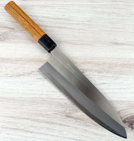 At 210mm in length, this knife is nice and tall with plenty of knuckle clearance, giving it a cleaver-like vibe. The double bevel and even edge grind make it a versatile tool for any chef.