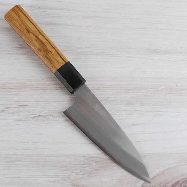 The Tabata Blue #2 Tall Petty knife measures just over 120mm on the edge. Crafted by hand and hammer-forged by Tabata Hamono, this exquisite blade hails from a quaint blacksmith shop on Tanegashima Island, nestled to the south of Kyushu's Kagoshima Prefecture. The knife features stainless cladding for effortless maintenance and a beautifully rendered kasumi finish. We at Chefknivestogo are honored to be the first US distributor for this distinguished brand. Explore and discover its unique charm.