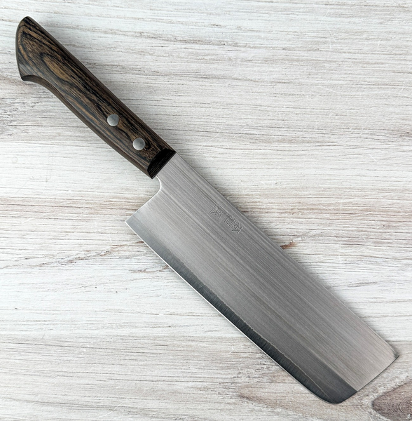 Crafted on Tanegashima Island south of Kagoshima, this nakiri features HAP40 semi-stainless steel, known for exceptional edge retention and wear resistance. The stainless cladding and kasumi finish provide a clean, misty look while helping with maintenance. The tall, flat profile excels at vegetable prep, offering excellent board contact and smooth push cutting. A comfortable brown pakka wood handle with a classic 2-rivet design rounds out the build. Chefknivestogo is proud to be the first U.S. dealer to offer these knives. HAP40 takes a very keen edge and holds it for a long time, though it requires a bit more effort to sharpen than simpler steels—use good stones and avoid bones or frozen foods to prevent chipping.