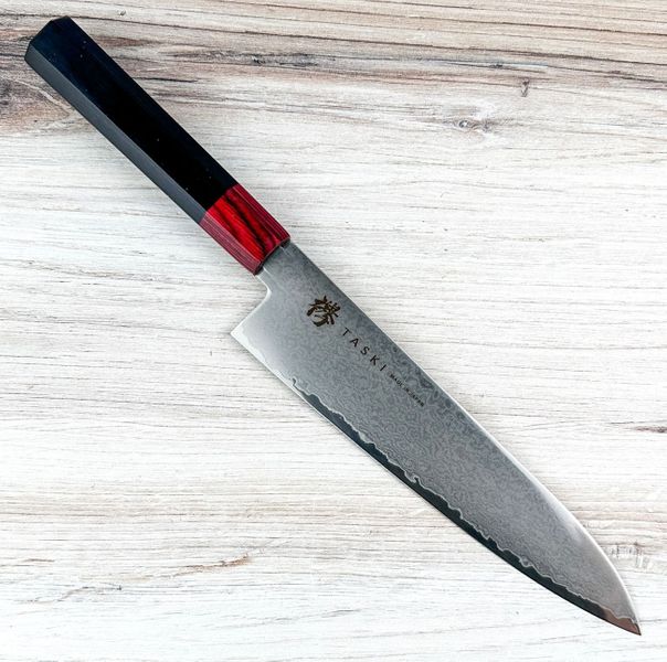 The Taski Kaizen Damascus Gyuto 210mm is handmade in Seki City, Japan, and built as a true all-purpose kitchen workhorse. Its 8.5" blade handles meat, fish, and vegetables with ease, while the light 5.0 oz weight helps reduce hand fatigue during extended prep. The octagonal laminated wood handle provides a secure, comfortable grip and balanced control for daily cooking.