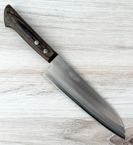 Crafted on Tanegashima Island south of Kagoshima, this compact 170mm gyuto is a versatile all-purpose knife that feels quick and agile in hand while still offering enough length for most kitchen tasks. It features HAP40 semi-stainless steel, prized for exceptional edge retention and wear resistance, clad in stainless steel with a refined kasumi finish that gives the blade a clean, misty look and easier maintenance. The profile provides a nice balance of flat spot and gentle belly, making it suitable for both push cutting and light rocking. The brown pakka wood handle with a classic 2-rivet design offers a comfortable, familiar grip. Chefknivestogo is proud to be the first U.S. dealer to offer these knives. HAP40 holds an edge for a very long time but takes more effort to sharpen than simpler steels, so quality stones and a bit of patience are recommended. Avoid bones and frozen foods to prevent chipping.