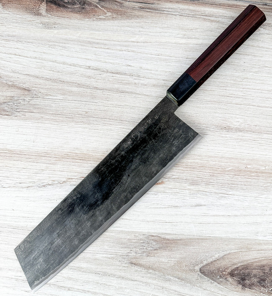 Brand: Takeda Hamono Blacksmith: Shosui Takeda Location: Niimi, Japan Construction: San Mai, Hammer Forged Core Steel: Aogami Super Cladding: Stainless Finish: Kurouchi Handle: Rosewood, Octagonal Ferrule: Black Pakka Wood Edge Grind: Even 50/50 Weight: 6.4 oz (182 g) Blade Length: 242 mm (9.5") Overall Length: 380 mm (15") Thickness at Heel: 2.9 mm Blade Height: 66.5 mm