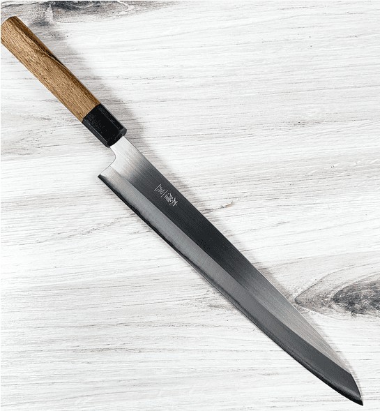 This impressive sujihiki is handcrafted by Tabata Hamono, a small blacksmith shop on Tanegashima Island south of Kagoshima in Kyushu, Japan. Chefknivestogo is proud to be the first dealer for this maker in the USA. The blade uses Blue #2 carbon steel at the core, clad in stainless steel for easier maintenance, and finished with a soft kasumi polish that gives the knife a refined, understated look. Blue #2 is loved for its excellent edge retention, fine grain structure, and ability to take a very sharp edge, making it a great choice for cooks who want high performance from a reactive carbon core without the full maintenance burden of an iron-clad blade.