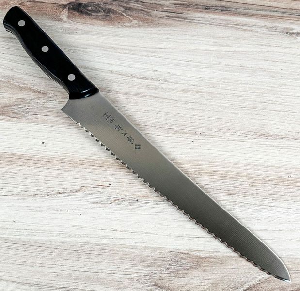 Made in Sanjo City, Japan, the blade uses molybdenum-vanadium stainless steel, a durable, low-maintenance alloy known for excellent corrosion resistance and long-lasting edge retention. It holds its bite through heavy use and requires very little upkeep. A black pakka wood handle provides a comfortable, secure grip. One of our longtime top sellers, this is a reliable, professional-grade bread knife that earns its place in any kitchen. Care Instructions: Hand wash and dry after use. Do not place in the dishwasher. Use a wooden or soft synthetic cutting board and avoid cutting frozen or extremely hard foods.