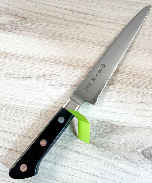 The TOJIRO CLASSIC serrated bread knife in 215mm is a perfect knife for cutting through crusty and soft breads and other slicing applications. Cooks often operate under the belief that serrated blades are one dimensional in character. This is not the case. This knife will do well slicing soft fruits and vegetables as well as meats.Weight: 6.3 oz (180 g)