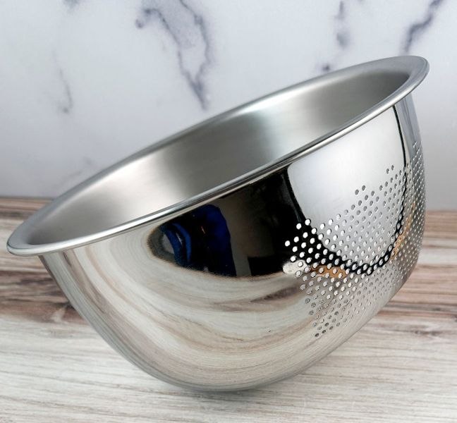 This stainless steel bowl from Tsubame, Japan is designed specifically for washing rice, rinsing vegetables, and draining ingredients quickly and cleanly. Made from durable 18-8 stainless steel, the bowl features a perforated section on one side and a curved internal foot that allows it to rest at an angle. This design lets you easily wash rice, rinse vegetables, mix ingredients, and drain water without needing a separate colander. It is especially useful for rinsing rice, where you can wash, swirl, and then tilt the bowl to drain excess water cleanly through the perforations.