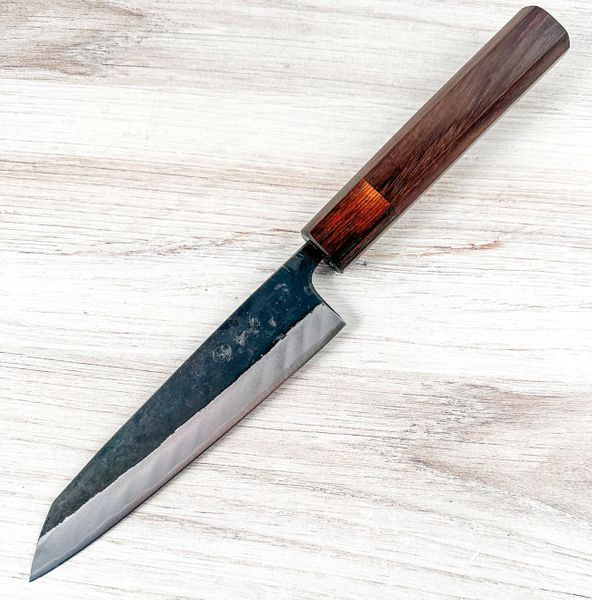 Considering the very low price point, this knife is well-made in terms of grinds and profile. It is a very traditional looking and feeling knife that makes little effort to please in terms of high levels of fit and finish. Rather, the effort has gone into producing a knife that is perfectly fit for purpose while being tough and quite easy to sharpen. The Blue #2 inner core is a great knife steel and, together with the kurouchi cladding of soft iron, presents a blade that is tough and will hold an edge for prolonged use.