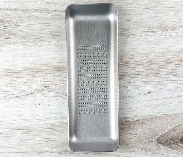 The Yoshikawa EAtCO Oros Large Grater is a refined stainless steel grater designed to move seamlessly from prep to presentation. Its rectangular tray shape allows you to grate daikon, ginger, garlic, cheese, citrus zest, and other ingredients directly into the base, capturing juices and flavor without extra bowls. The sharp, evenly spaced teeth cut cleanly and efficiently, while the generous surface area makes quick work of larger ingredients.