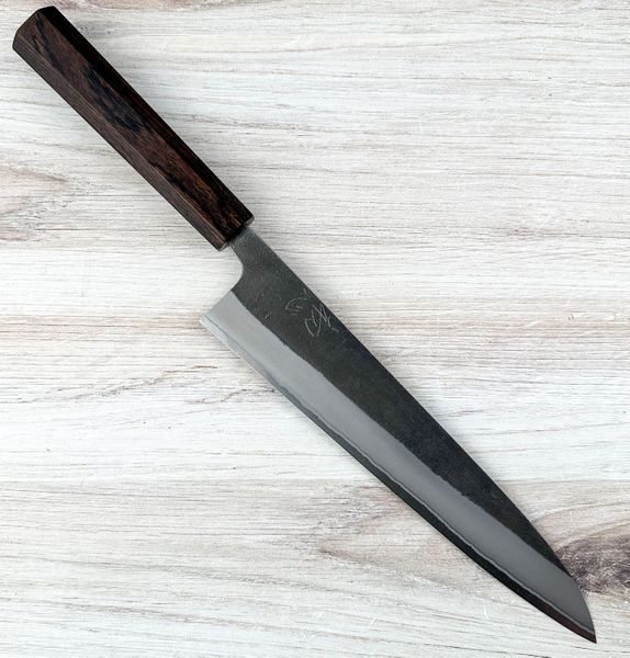 Blacksmith: Yamamoto San Maker: Yoshikane Hamono Location: Sanjo City, Japan Construction: San Mai, Hammer Forged Edge Steel: White #2 Carbon Steel Hardness: HRC 63 ± Cladding: Stainless Finish: Nashiji Edge Grind: Even (See Choil Photo) Weight: 6.4 oz (182 g) Edge Length: 245 mm Total Length: 405 mm Spine Thickness at Heel: 4 mm Blade Height: 50 mm Handle: Solid Mahogany Octagonal
